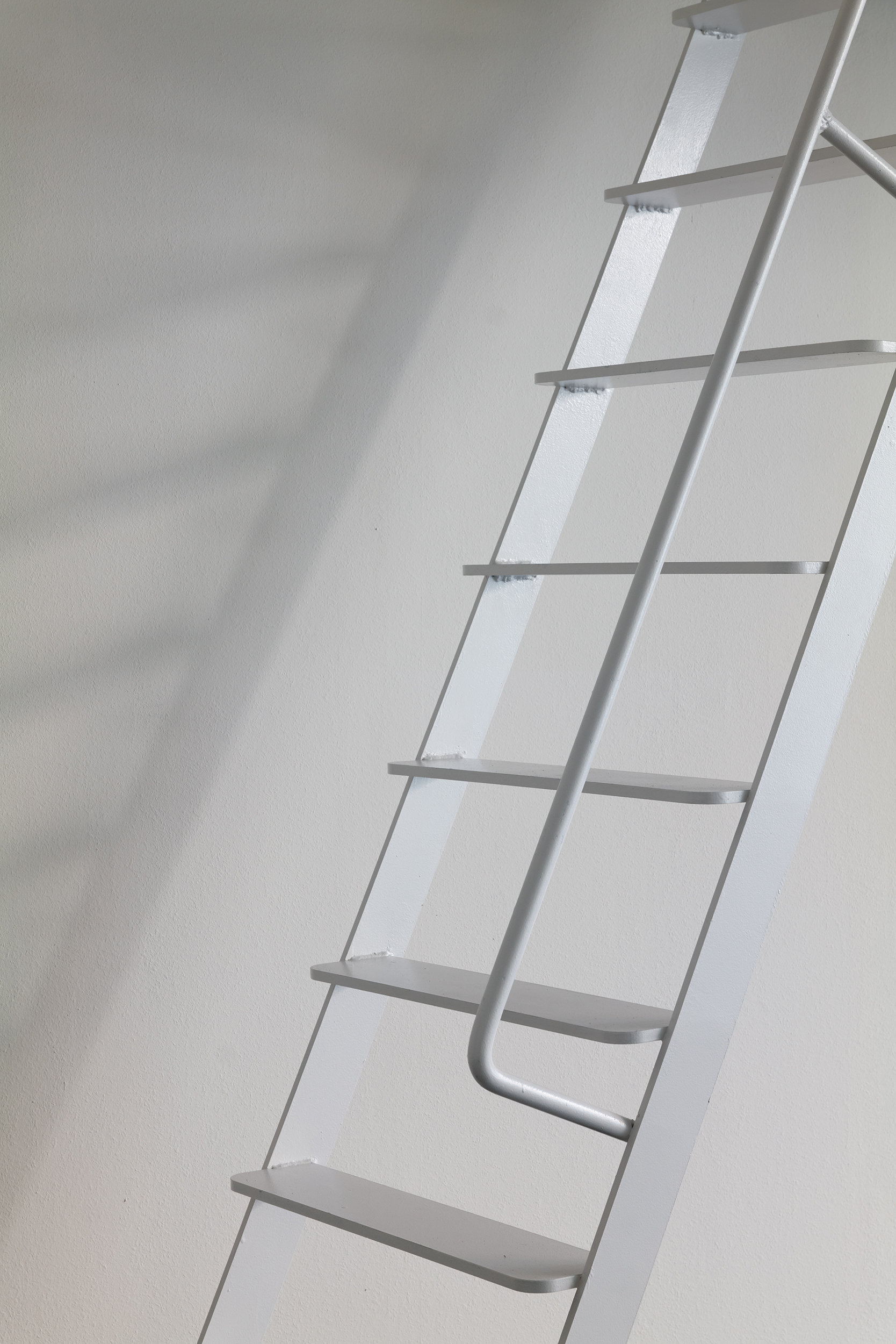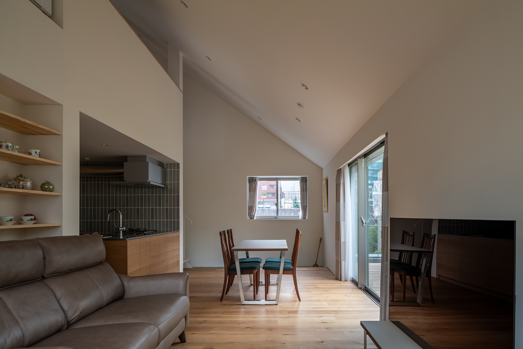 住居部分はさながらペントハウスの様相を呈している。テラスが周りをとり囲み室内の床とシームレスにつながっていく。斜線制限を回避しながら大胆に削ぎ落とされた屋根形状は、そのままインテリアに勾配天井となってあらわれ、水廻りと収納を収めたボックスの上に寝室、残りはすべて食事と団欒のスペースという極めてシンプルな構成である。