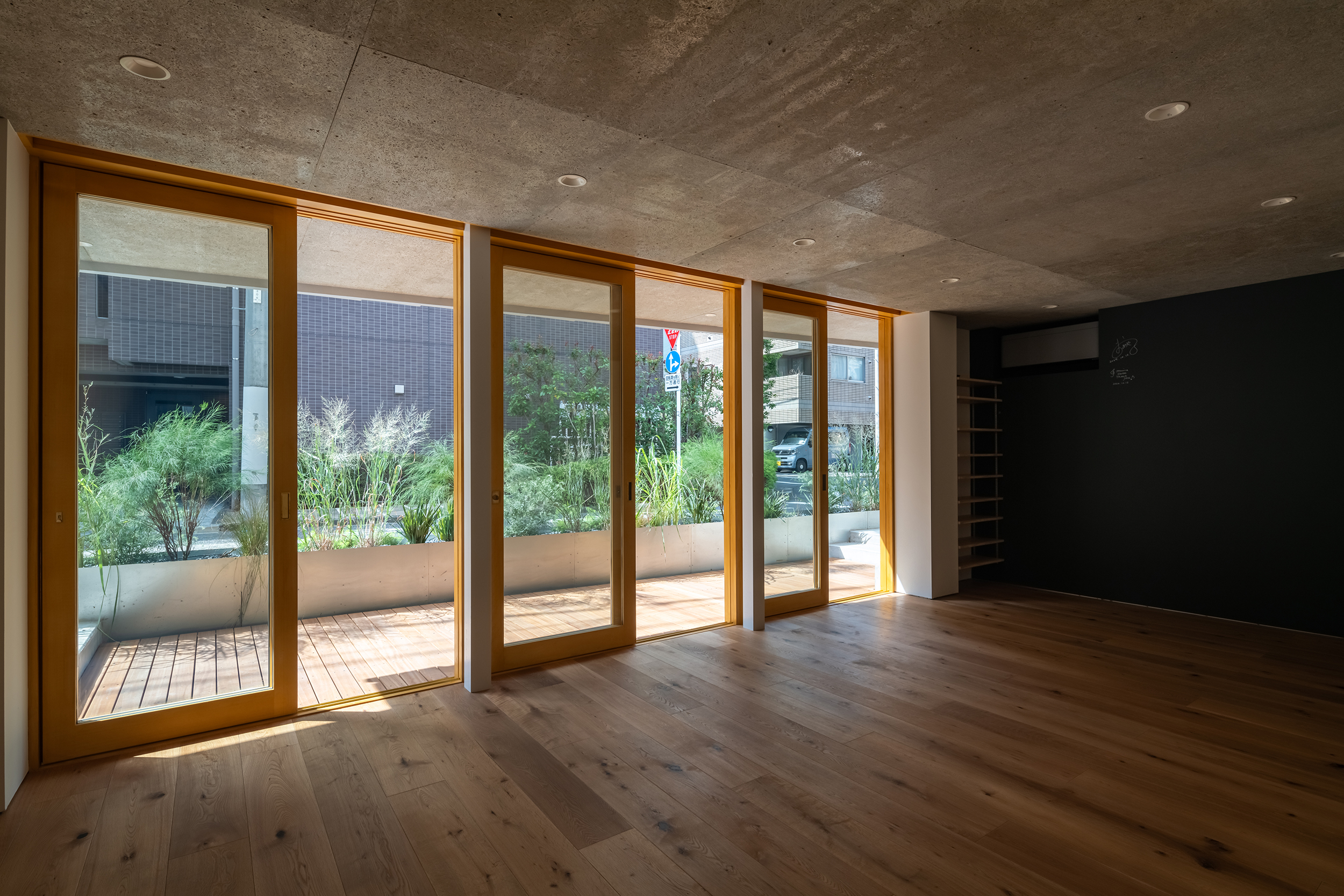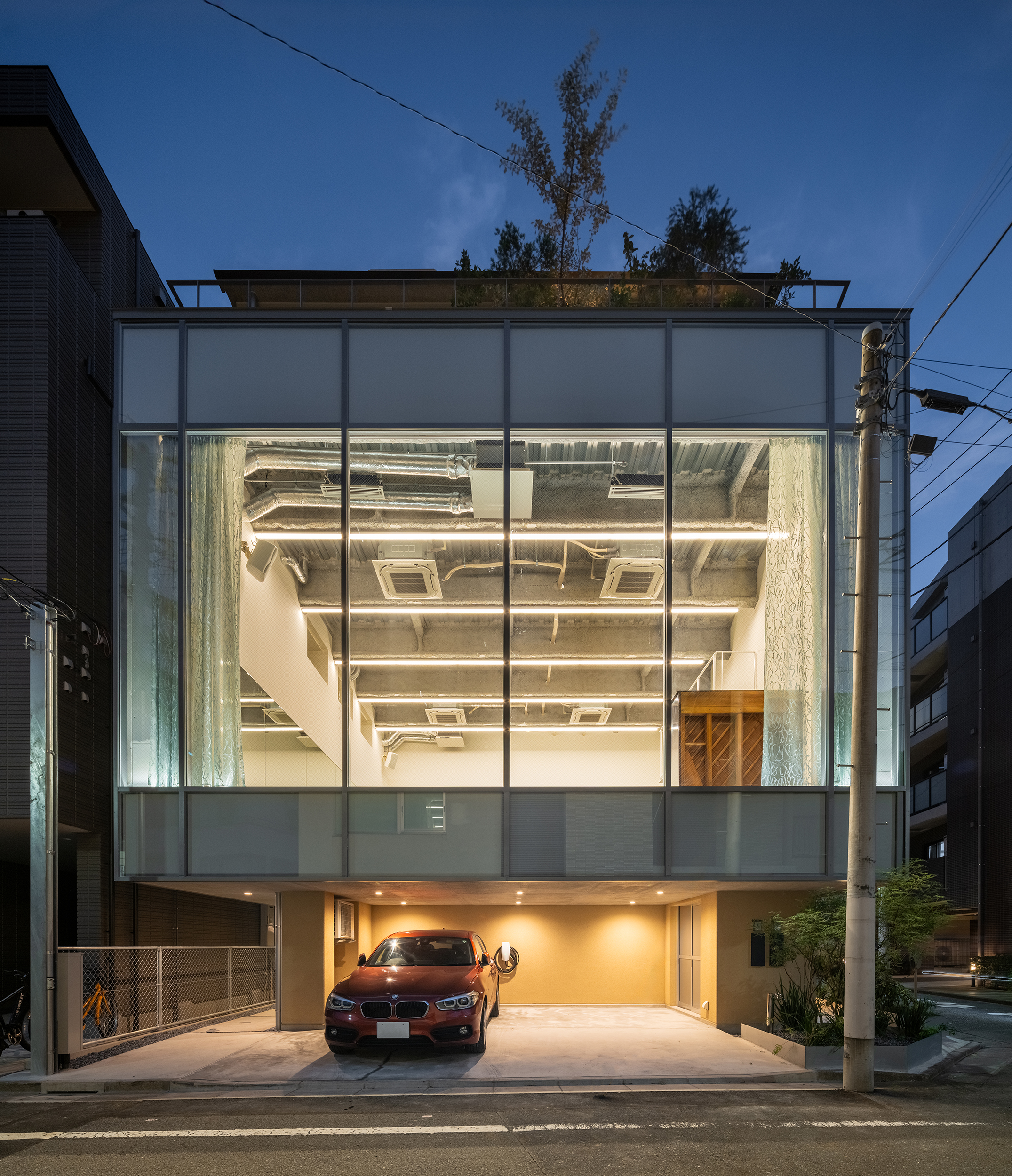 そこで、私たちはこの場所が街の小さなオアシスとなれるよう、緑を抱え込むような建築をつくりたいと考えた。建主はこの街で生まれ育ち、教室もこの街とずっと共にあり続ける。街にたいしてささやかな恩返しとなるような建設の行為でありたいとおもった。まずはスタジオの床面積を最大限確保し、大きな跳躍に十分な高さとして有効を4.2mに設定した。床は地面から切り離され、上下それぞれ小さなボリュームが積み重なる。下層はガレージとスタジオの付属機能、上層は少人数での暮らしを想定したコンパクトな住宅である。これらボリュームどうしのズレが空隙を生み、軒下やテラスとなってグリーンをふんだんに取り込んでいる。
