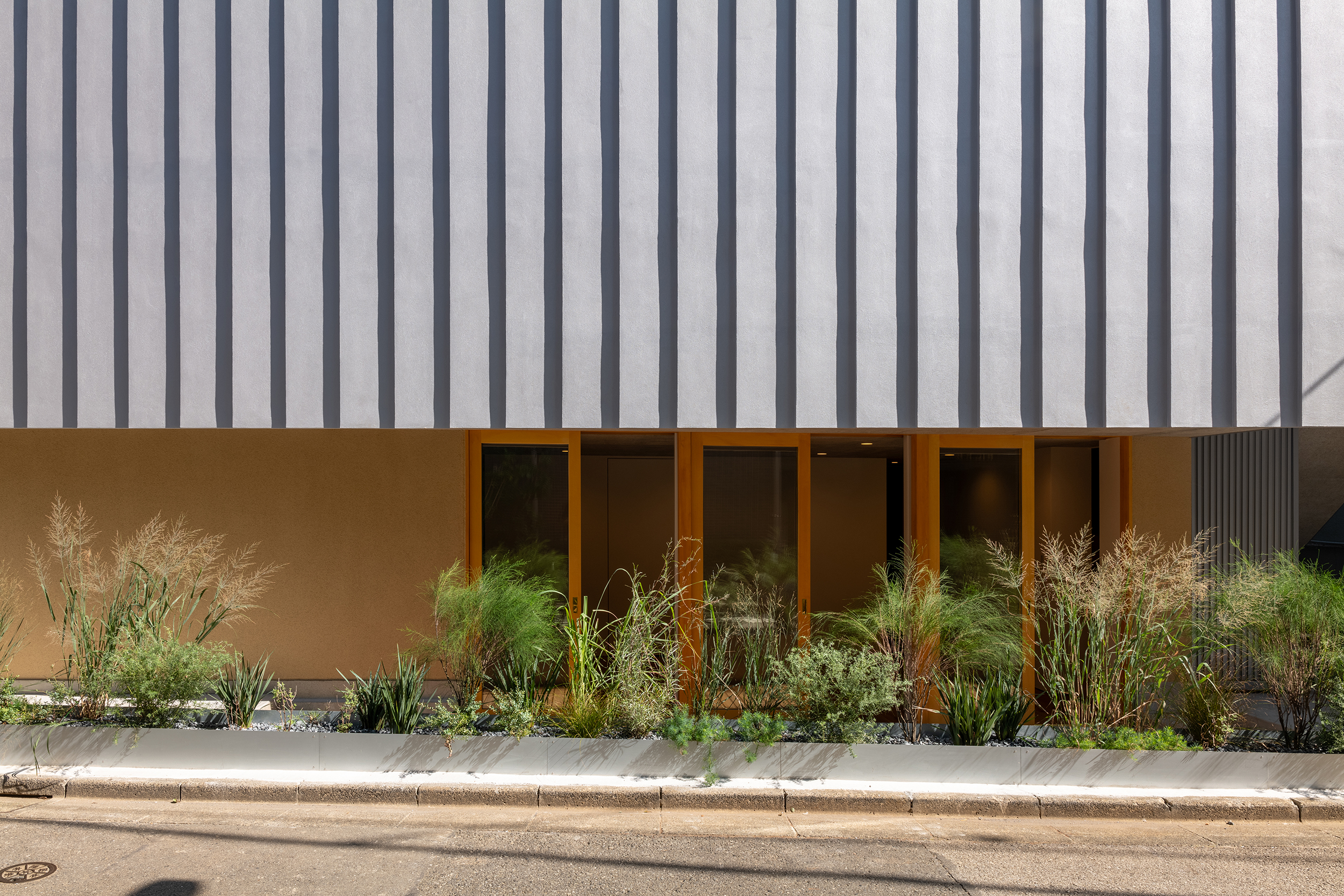 建主が主催するバレエ教室では一貫して公演(発表会)をたいせつにしてきた。建築側でもこの精神を受け継ぎ、劇場を一つのモデルとして考えてみることにする。北側開口をプロセニアム、テキスタイルを緞帳と見立てればスタジオは舞台へと変わり、外の都市は客席となって広がっていく。ガレージの天井高を限界まで抑え舞台レベルを道路面に近づけることで街との距離を縮めようと試みた。